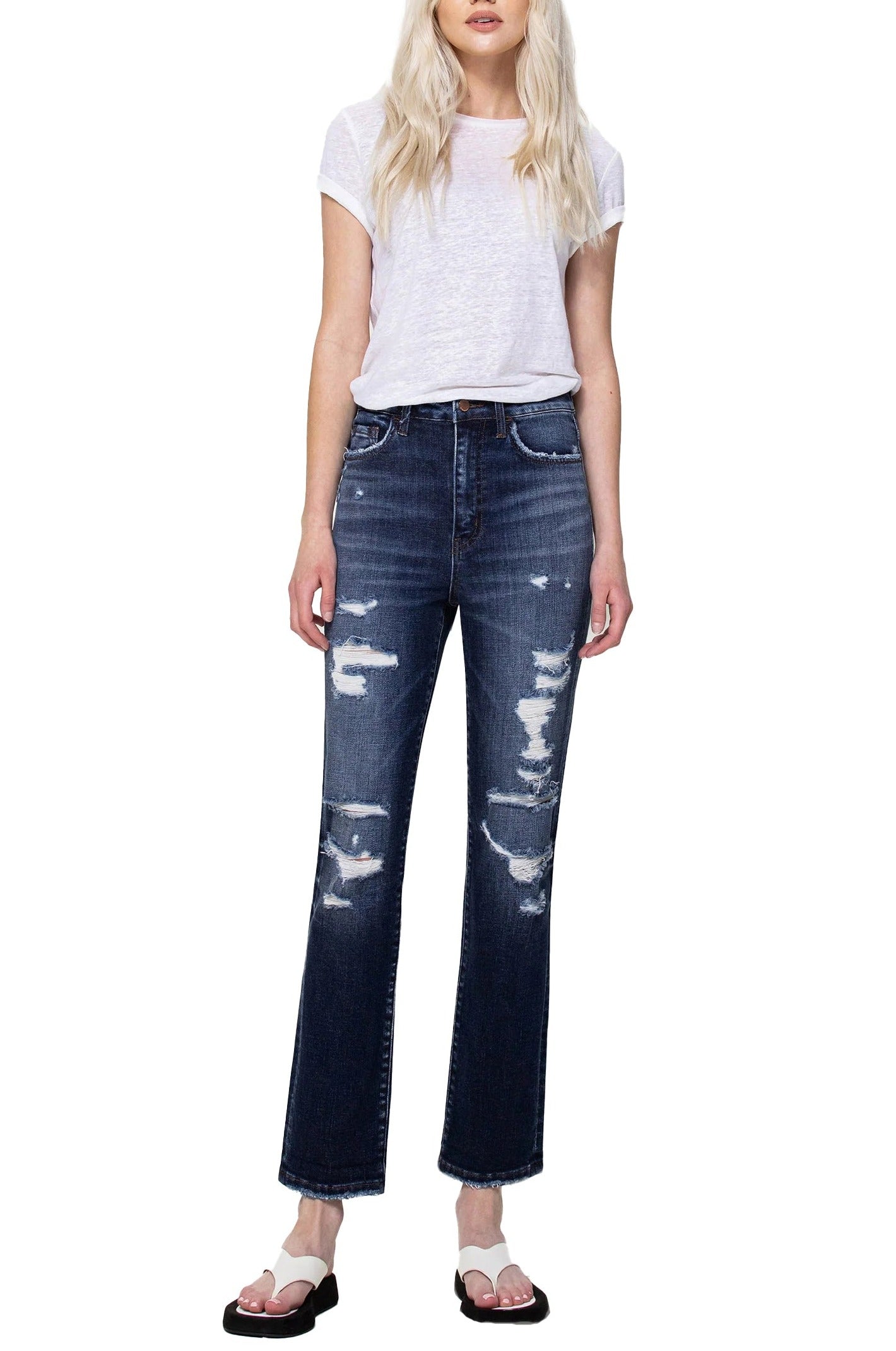 Description: Achieve a bold and authentic vintage look with the Flying Monkey Super High Rise Distressed Straight Jeans. As seen in the photo, this pair features a deep indigo dark wash characterized by heavy whiskering and high-contrast fading that creates a sharp, modern edge. The 11" super high rise cinches the waist for a snatched silhouette, while the straight-leg fit is heavily accented with multi-rip distressed details along the front for a truly lived-in, edgy feel.