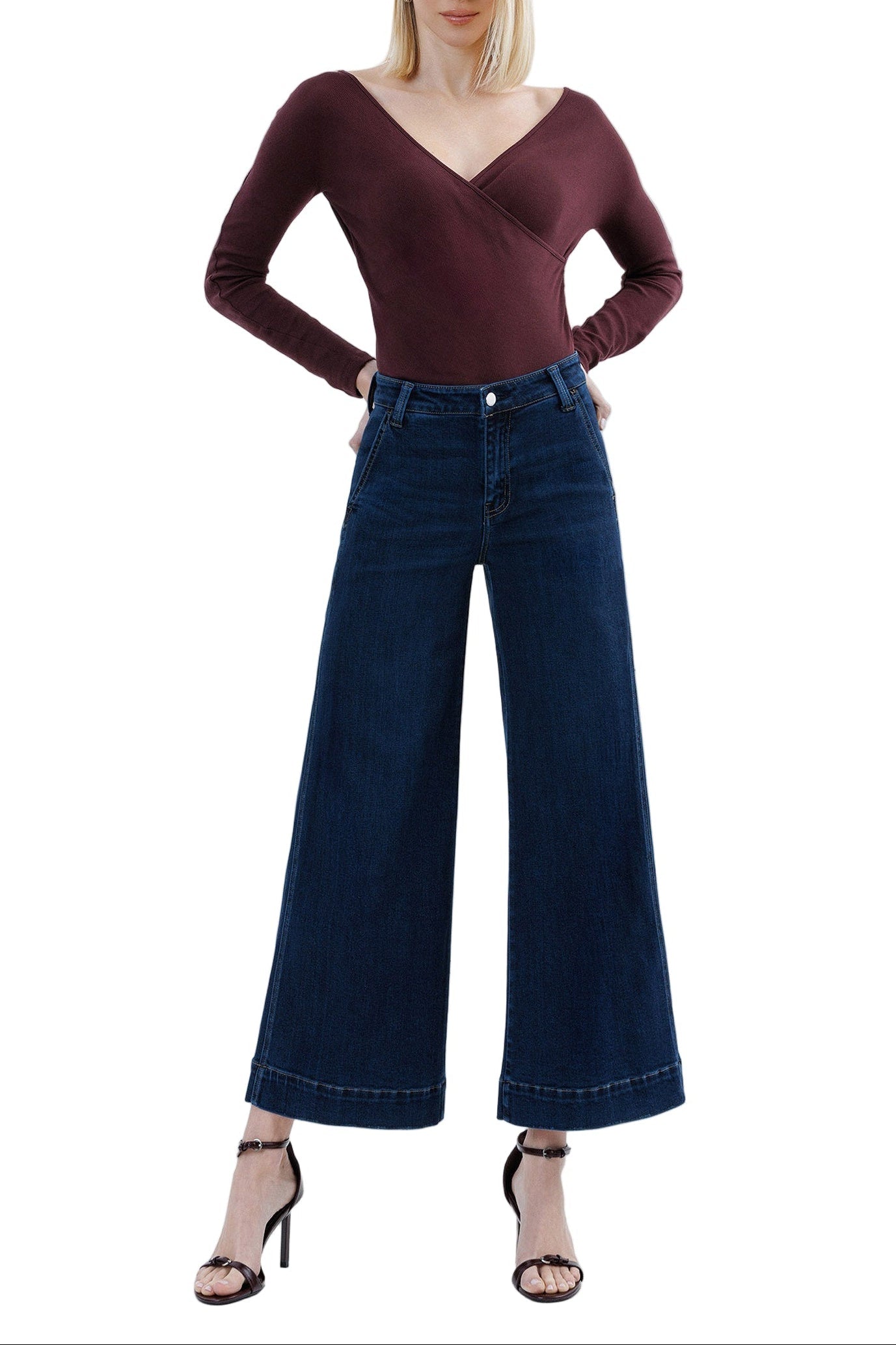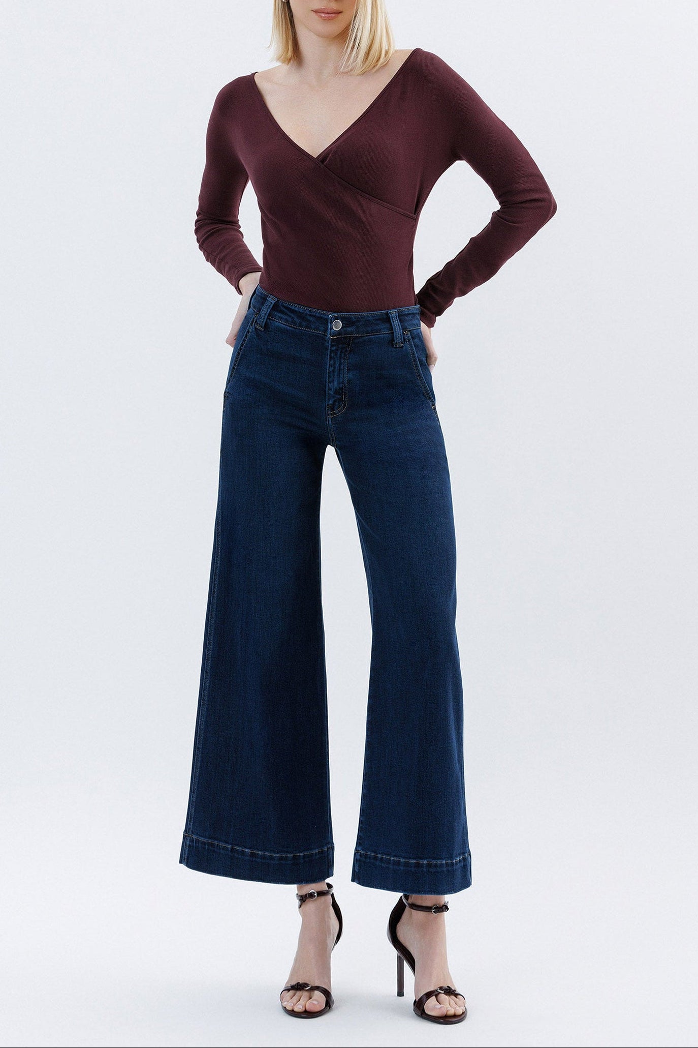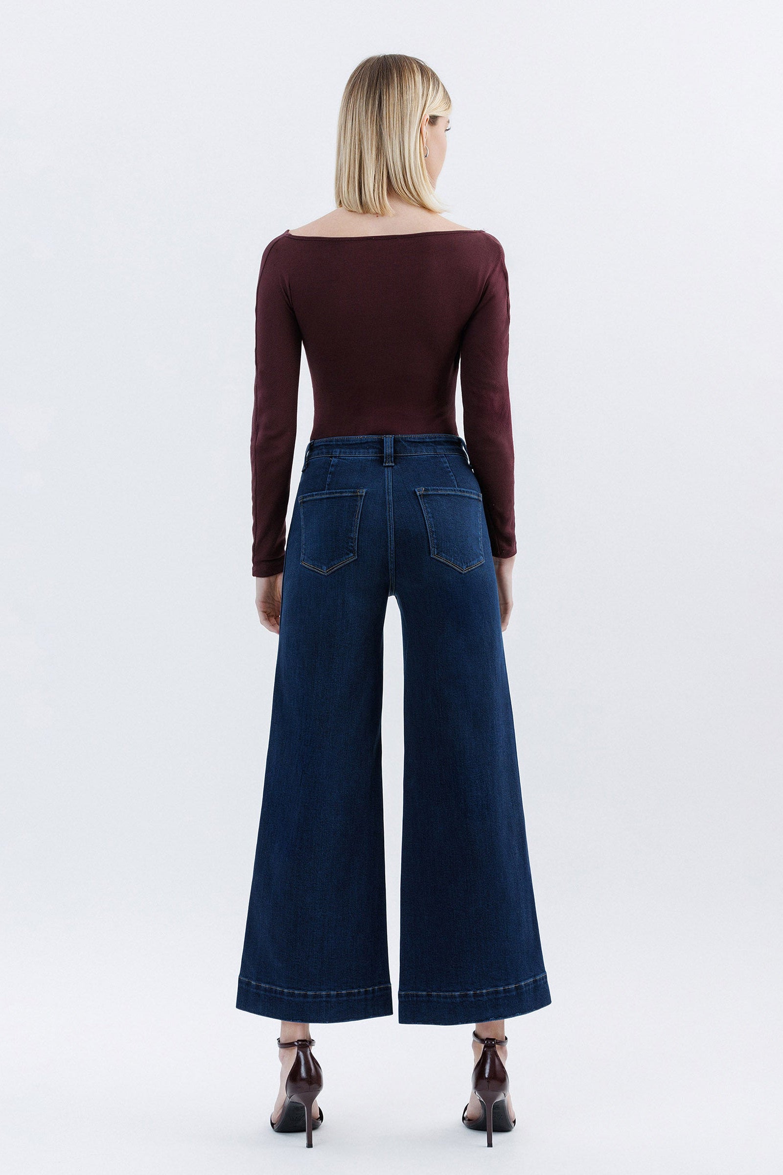 Description: Elevate your denim collection with the Flying Monkey High Rise Ankle Wide Leg Jeans. These jeans feature a sophisticated, deep indigo wash with subtle tonal whiskering for a polished, modern aesthetic. The 10" high-rise waist sits perfectly at the natural waistline to define your frame, while the dramatic 26" wide-leg opening provides a flowing, elegant silhouette from hip to hem.