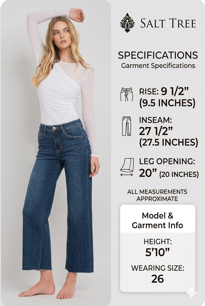 Description: Master your silhouette with Vervet's Tummy Control Mid-Rise Wide Leg Jeans in the sophisticated dark wash "Finders Keepers." These jeans incorporate innovative inner panels specifically engineered to shape and smooth the midsection for an enhanced, flattering fit. The modern wide-leg profile is complemented by a chic cropped length and a clean-cut raw hem, providing a polished yet relaxed aesthetic. A versatile essential, this non-distressed pair is perfect for a streamlined, fashion-forward look.