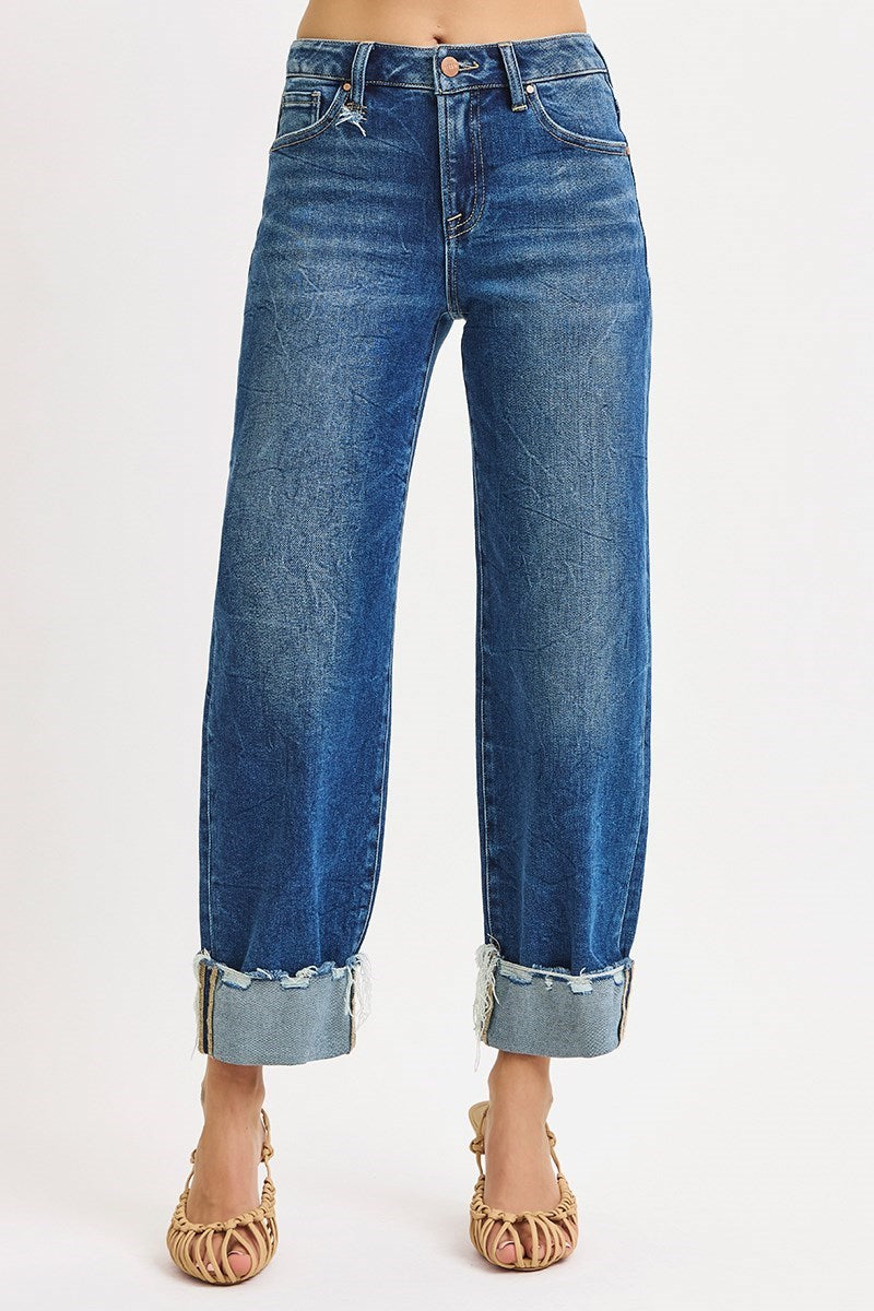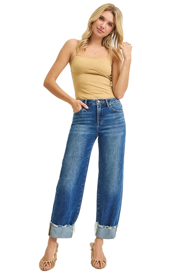 Description: Update your casual rotation with these Risen High Rise Boyfriend Jeans. Featuring a relaxed silhouette and adjustable cuffed hem, these jeans offer a perfectly lived-in vintage medium wash with authentic fading for effortless everyday style.