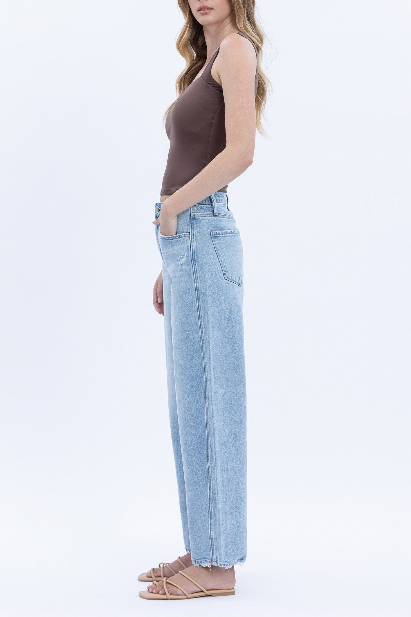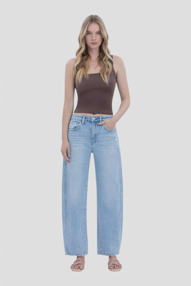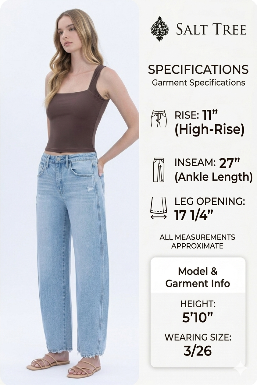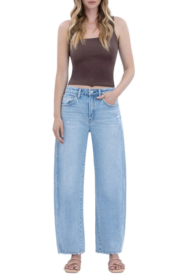 Description: Elevate your denim game with these Vervet Super High Rise Barrel Leg Jeans. Featuring a unique barrel leg silhouette and a lightly distressed detail, these jeans offer a modern, architectural fit that is both trendy and comfortable. The light wash and cropped length make them the perfect choice for showing off your favorite footwear while maintaining a relaxed, effortlessly cool aesthetic.