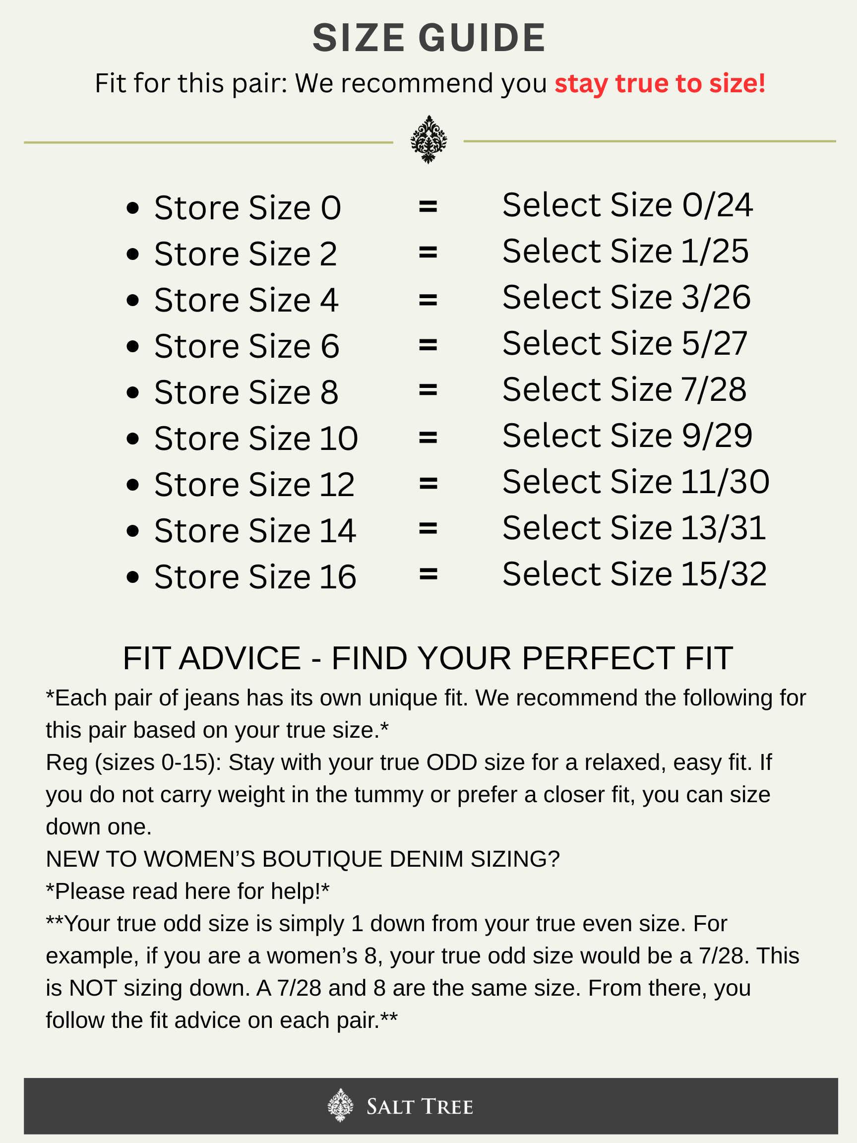 NEW TO WOMEN’S BOUTIQUE DENIM SIZING? Your true odd size is simply 1 down from your true even size. For example, if you are a women’s 8, your true odd size would be a 7/28. This is NOT sizing down; a 7/28 and 8 are the same size. From there, you follow the fit advice on each pair.