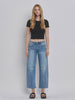 Description: Elevate your denim rotation with Vervet's High-Rise Structured Barrel Leg Jeans in the vibrant medium wash "Tingle." These jeans feature unique knee dart detailing and architectural side paneling to create a voluminous barrel silhouette. This non-distressed style offers a clean, modern aesthetic with a cropped length that balances the curved leg shape. Finished with classic five-pocket styling, they are a perfect statement piece for any fashion-forward wardrobe.