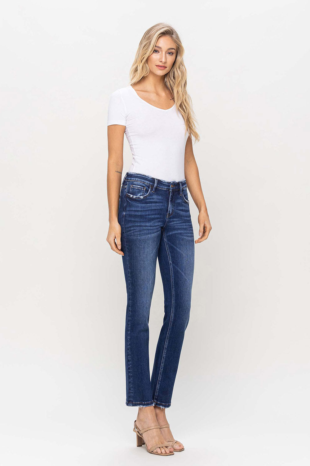 Description: Discover your new favorite daily denim with the Flying Monkey Mid-Rise Ankle Slim Straight Jeans. This pair features a deep medium-dark wash with artistic whiskering and hand-sanded fading designed to contour and slim the legs for a flattering, elongated silhouette. The 9" mid-rise waist sits perfectly on the hips for a classic, comfortable fit, while the slim straight profile is accented by subtle distressed nicks at the pockets and a trendy raw, frayed hem, adding a touch of lived-in character to a polished design.