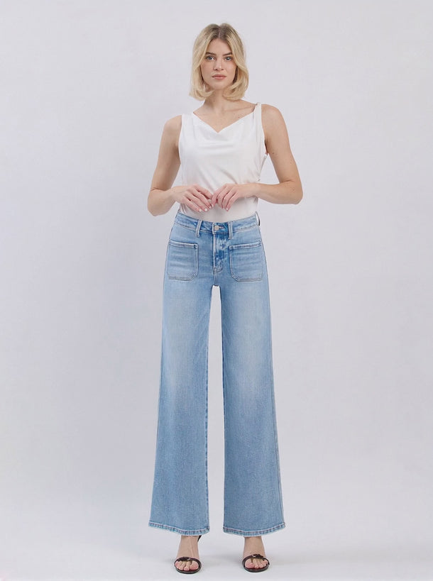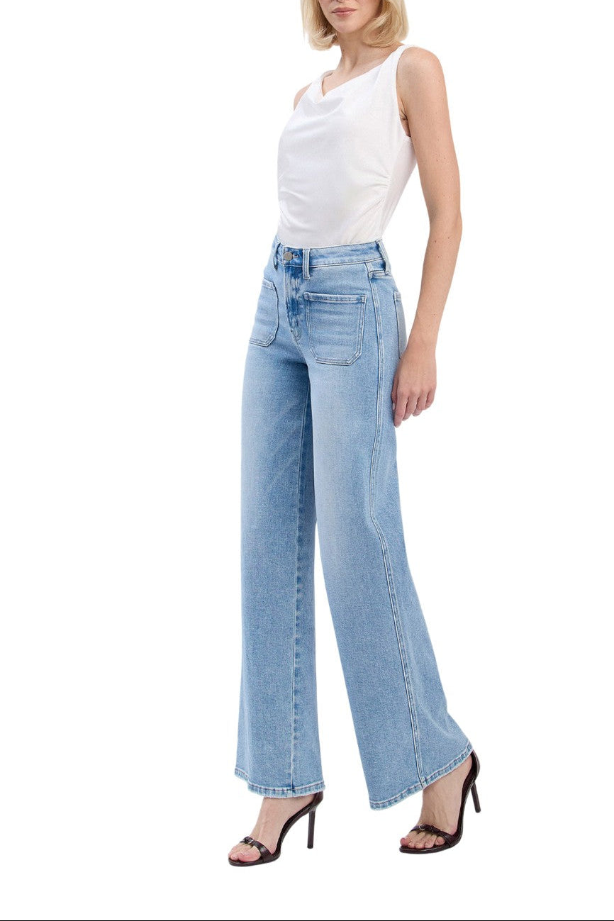 Flying Monkey - High Rise Light Wash Patch Pocket Wide Leg Jeans (33" Inseam) - F6058