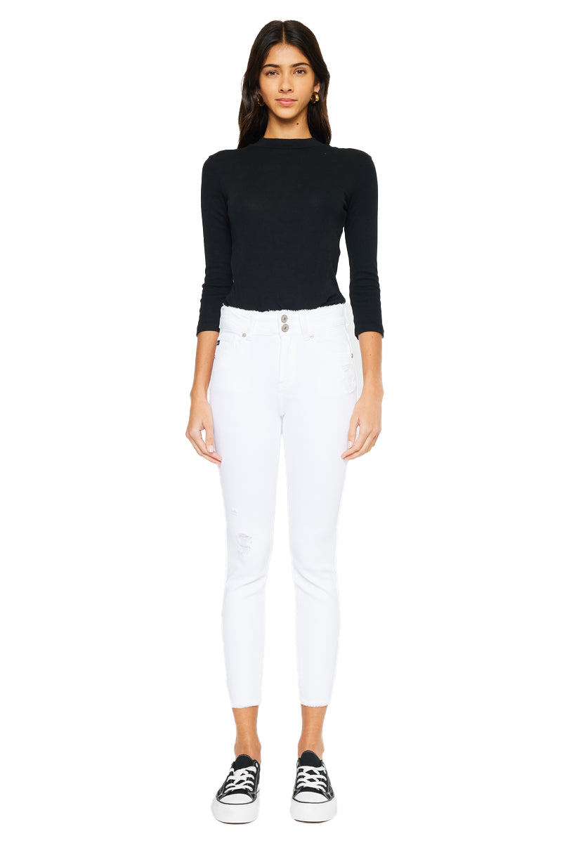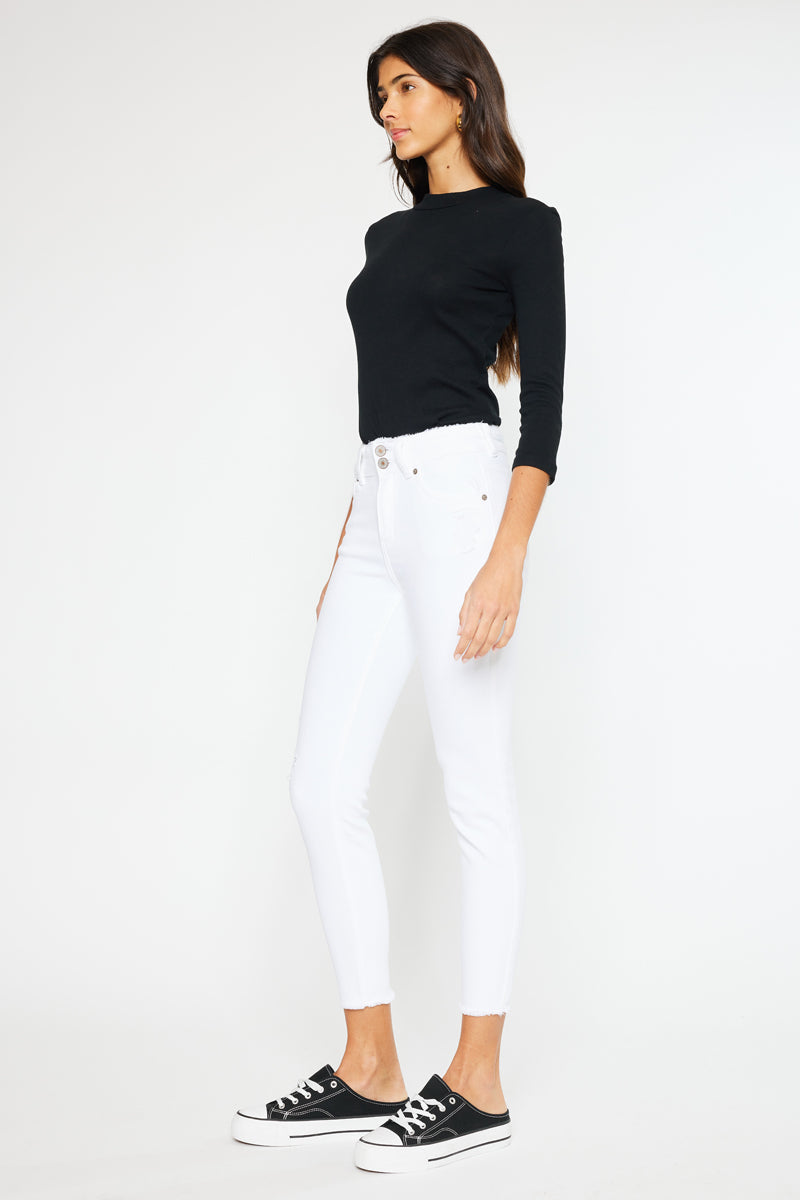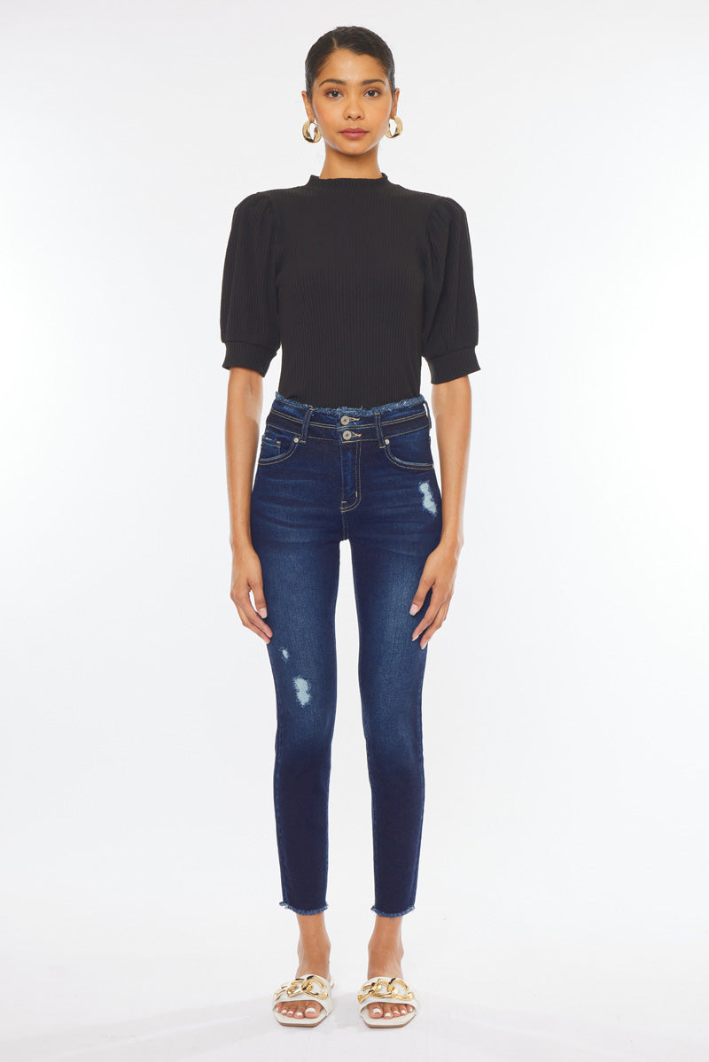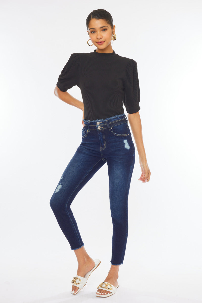 Description: A pair of five pockets Kancan high waisted jeans, with two buttons for closure, distressed details near the pockets, over the knee, and fringed on the ankle. with a skinny fit and an ankle-length cut.