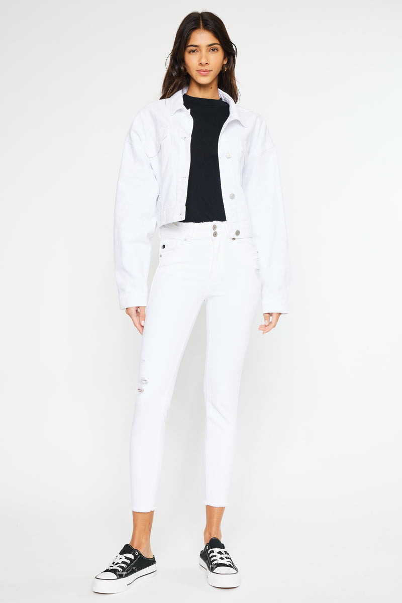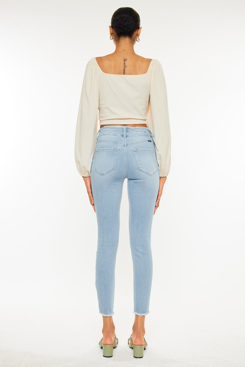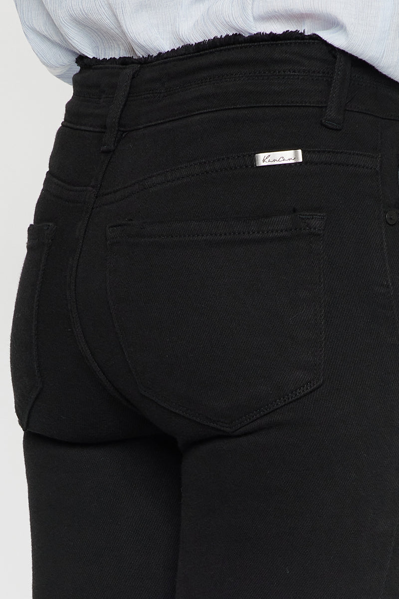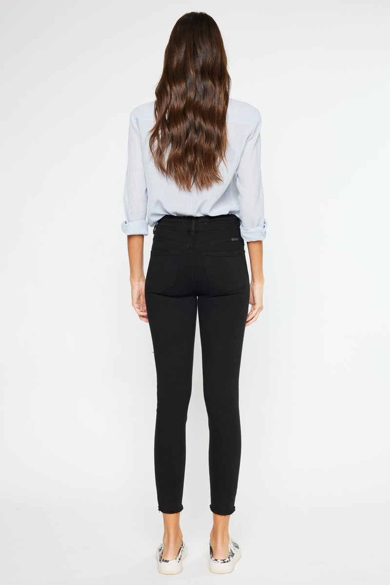 Description: A pair of five pockets Kancan high waisted jeans, with two buttons for closure, distressed details near the pockets, over the knee, and fringed on the ankle. with a skinny fit and an ankle-length cut.