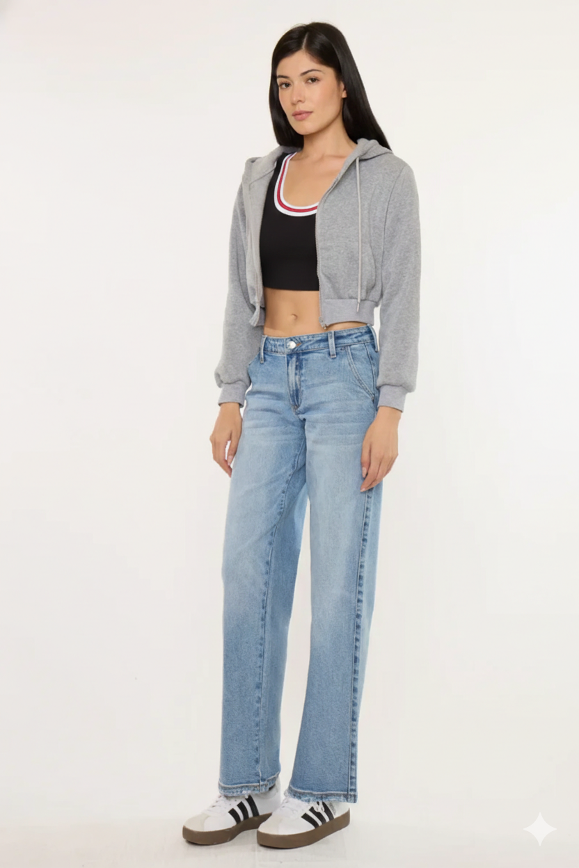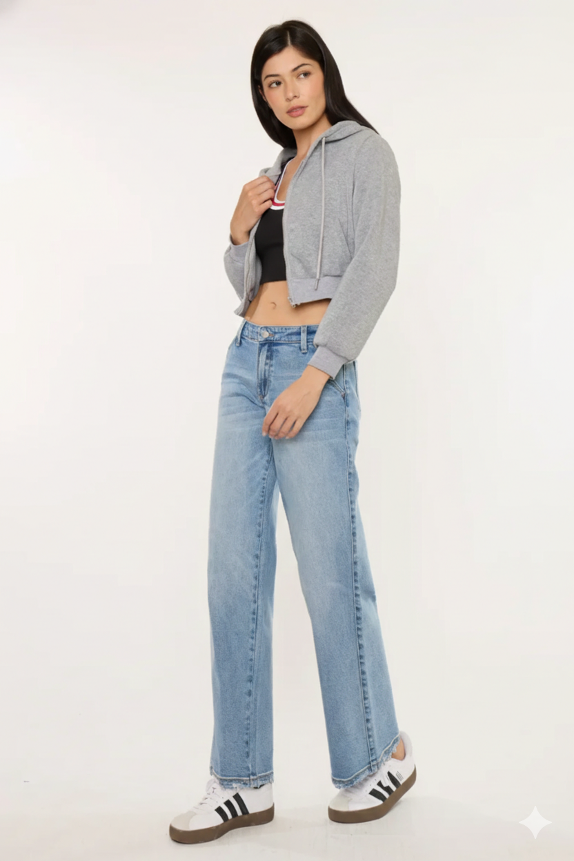 Description: The Alma Essentials Mid Rise Wide Leg Trouser from Kancan offers a sophisticated and trendy aesthetic in a classic medium wash. This clean-cut style is designed to sit slightly below the natural waist and flare into a dramatic wide trouser leg. Elevating the design, it features no distress details, slant front pockets with faint whiskering, and elegant dart details at the back for a tailored finish. Crafted with a thick fabric feel, these trousers are engineered to provide maximum comfort during movement while ensuring the denim keeps its shape through repeated wears and washes.