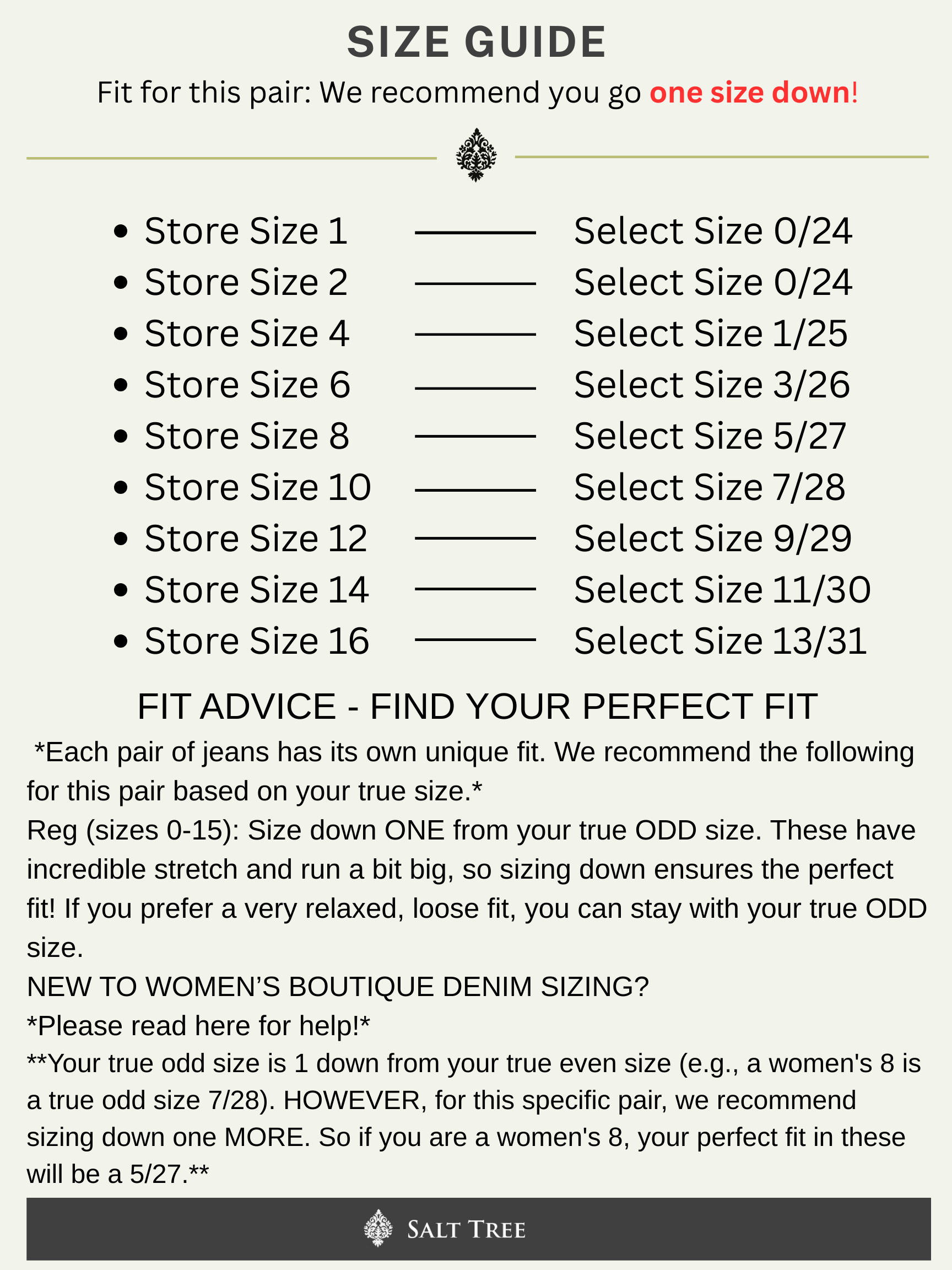 NEW TO WOMEN’S BOUTIQUE DENIM SIZING? Your true odd size is 1 down from your true even size (e.g., a women's 8 is a true odd size 7/28). HOWEVER, for this specific pair, we recommend sizing down one MORE.