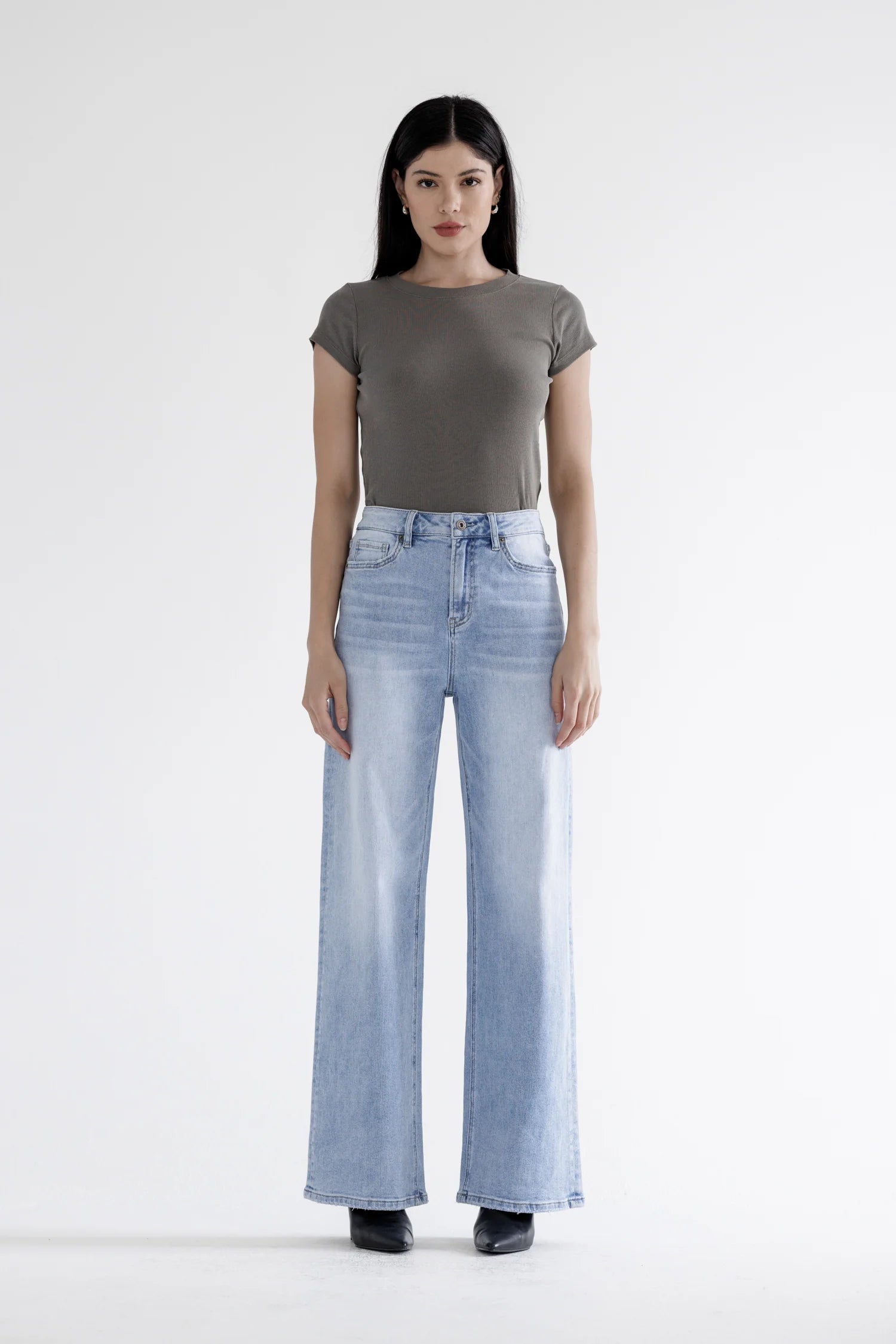 Description: Achieve the ultimate leg-lengthening silhouette with Mica Denim’s Super High Rise Loose Straight Jeans. Featured in a classic light blue wash with natural whiskering and subtle thigh fading, this non-distressed pair offers a clean, versatile finish for elevated everyday wear. The relaxed yet structured design provides a modern look that transitions perfectly from casual to sophisticated.