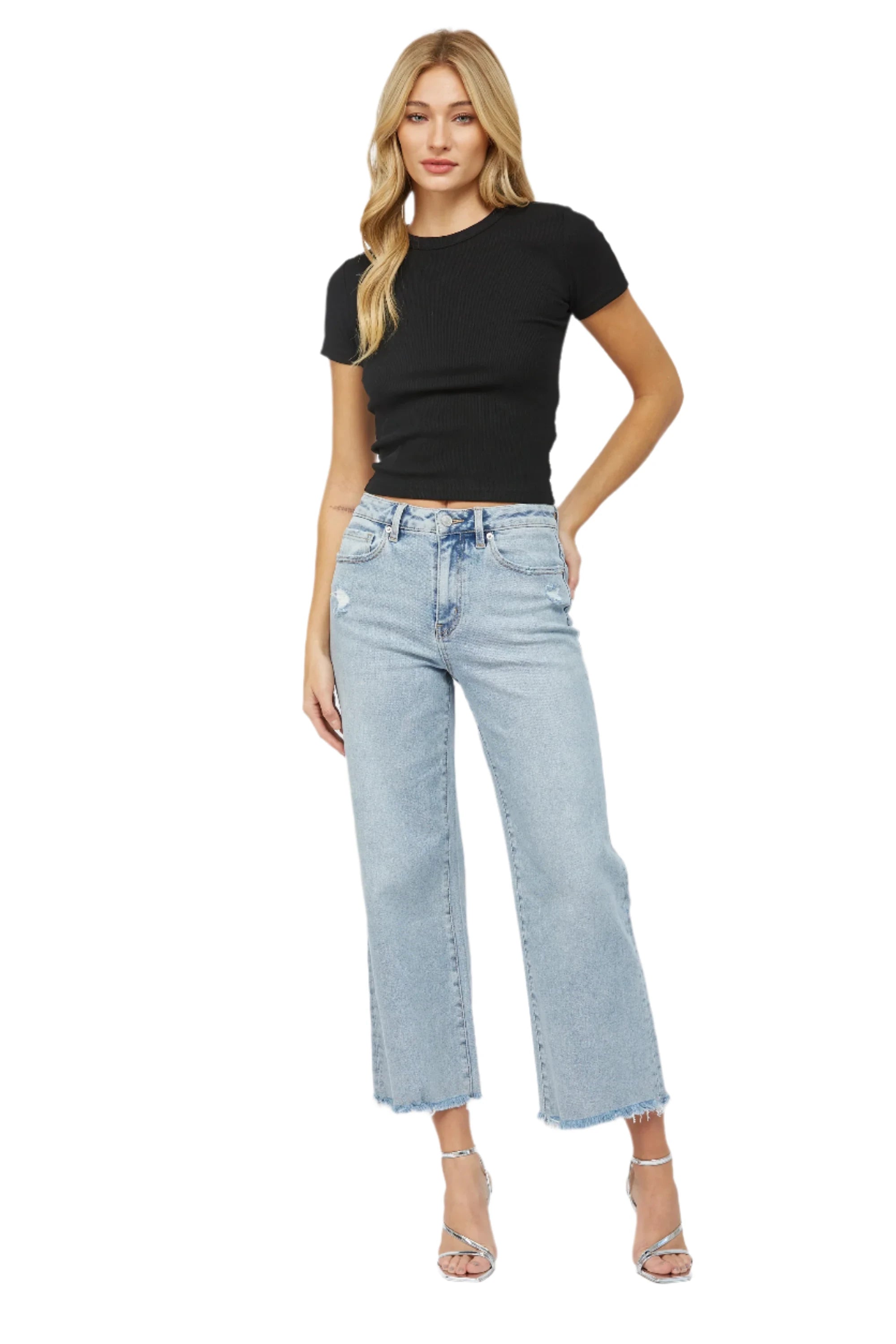Description: Refresh your denim rotation with the High Rise Raw Hem Ankle Wide Leg Jeans from Mica Denim. As seen in the photo, this pair features a stunning icy light wash—a fresh, near-white blue that is perfect for bright, sunny days. The vintage appeal is elevated by subtle distressed details around the pockets and a trendy raw hem (frayed edge) that adds a relaxed, undone vibe to the overall look. Crafted from a premium cotton-rich blend (98% Cotton), these jeans offer a structured, authentic denim feel while remaining soft against the skin.