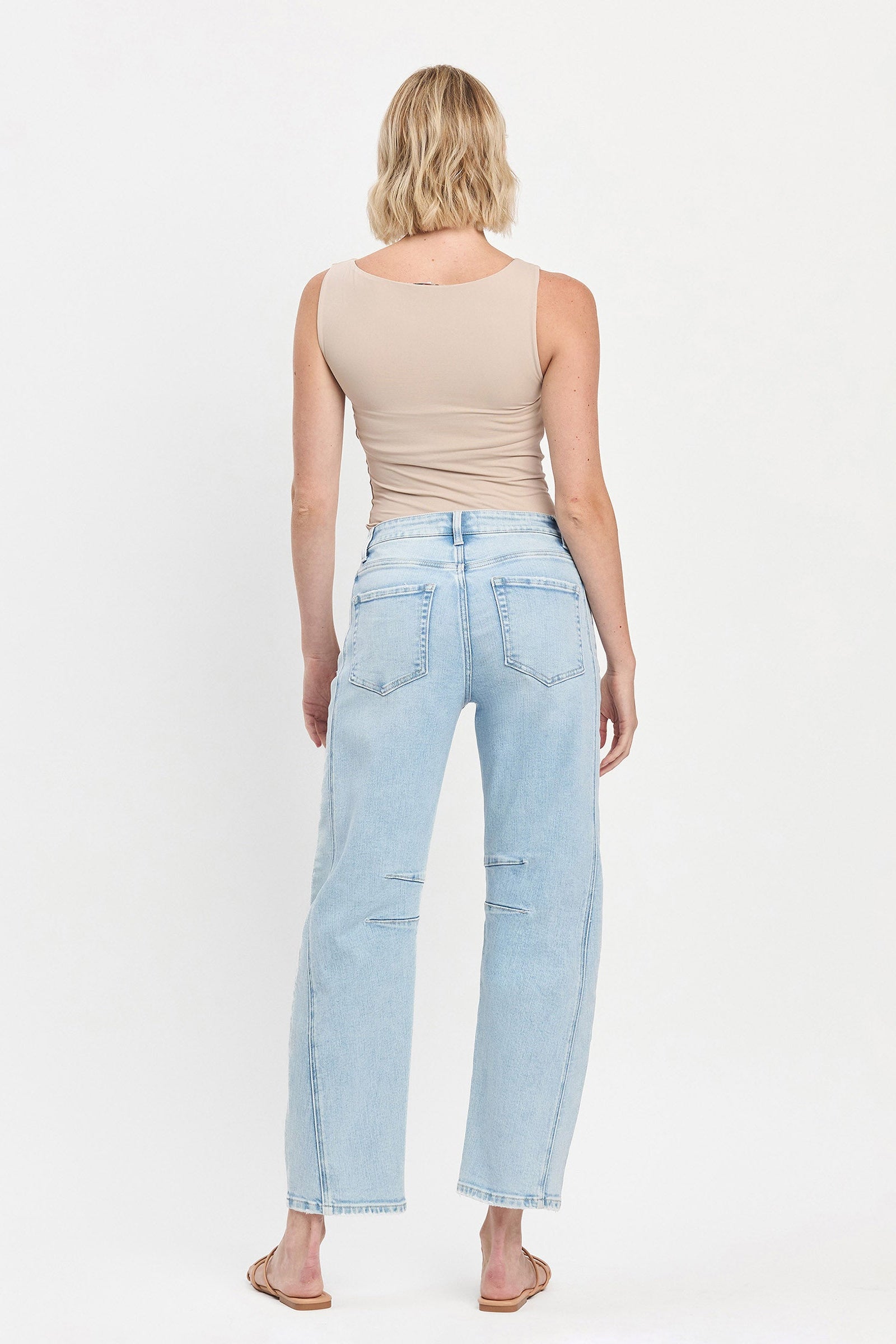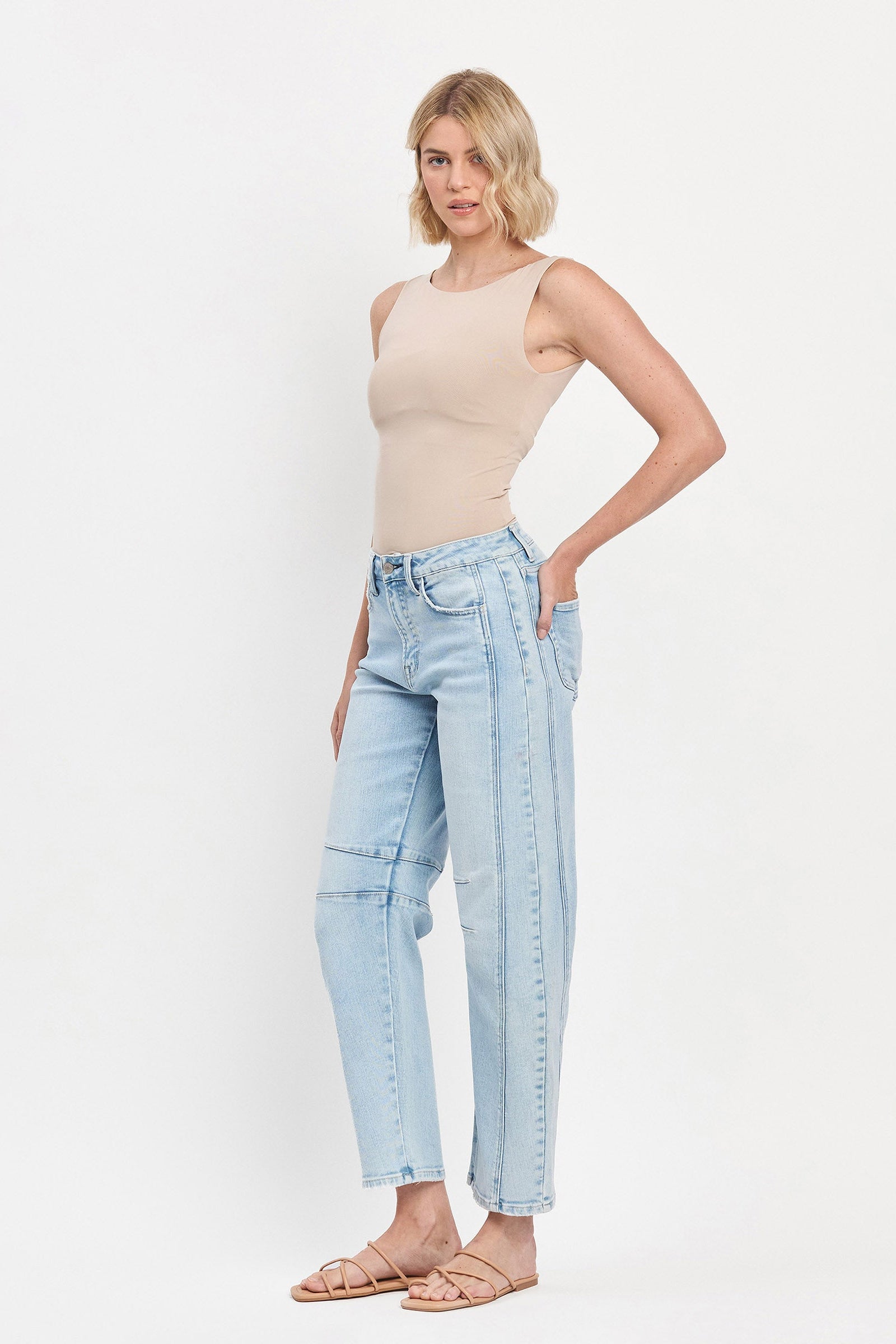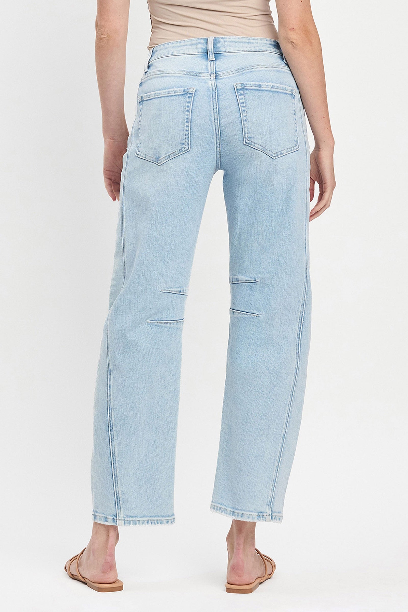 Description: Elevate your denim collection with the High Rise Light Wash Barrel Leg Jeans from Flying Monkey. This on-trend silhouette features an architectural curved leg that tapers at the ankle, creating the highly sought-after "barrel" fit. The "Northern Lights" light wash offers a crisp, vintage-inspired look, while the unique seam detailing adds a touch of structural interest to the clean design. These cropped jeans are the perfect way to add a modern, fashion-forward edge to your everyday rotation.