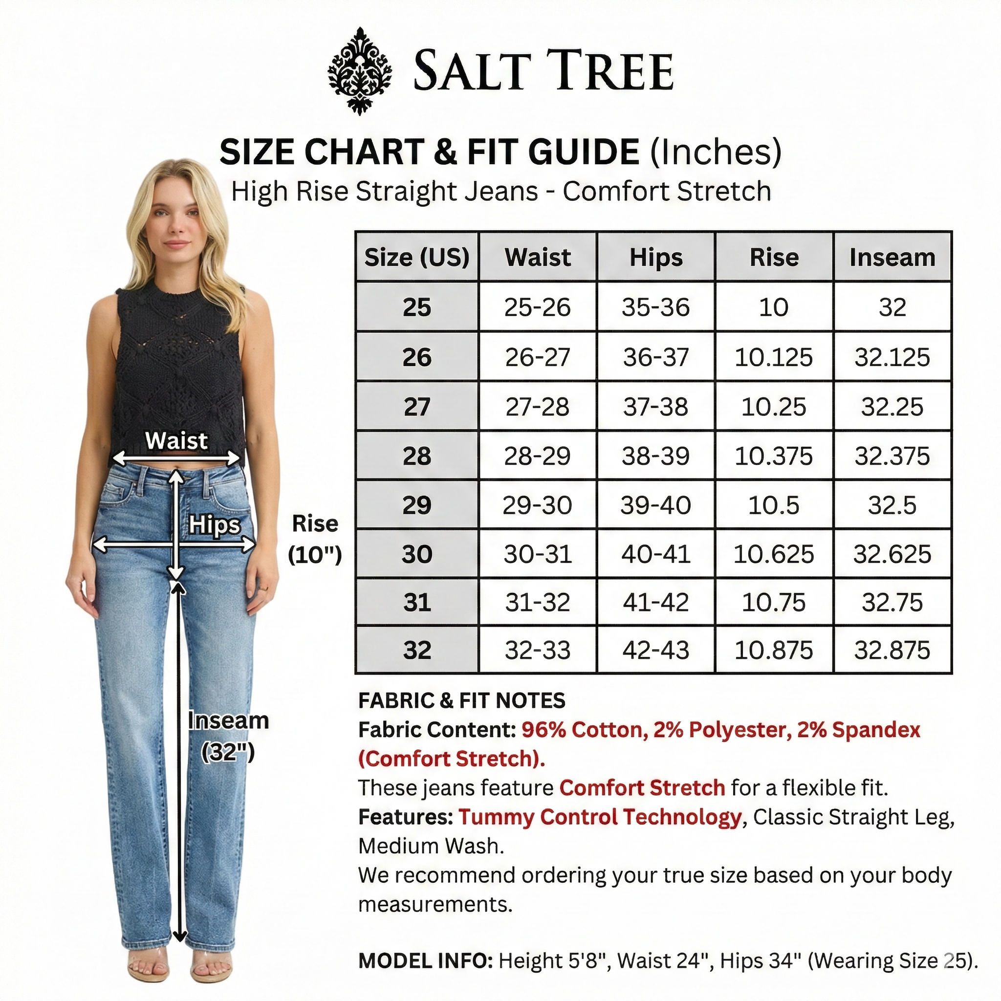 Fit Alert: Rise: 10" (High Rise) | Inseam: 32" (Full Length) | Model is 5'9" wearing size 1/25 This style runs True to your ODD size. Crafted with a premium cotton blend (96% Cotton) for an authentic look with a Comfort Stretch feel for all-day flexibility. Since these feature a 32" inseam, they are considered an Extra Long Inseam and are very Tall girl friendly. We recommend high heels/platforms to complement the length and suggest checking the 32" inseam to ensure this extra-long length matches your style preference.