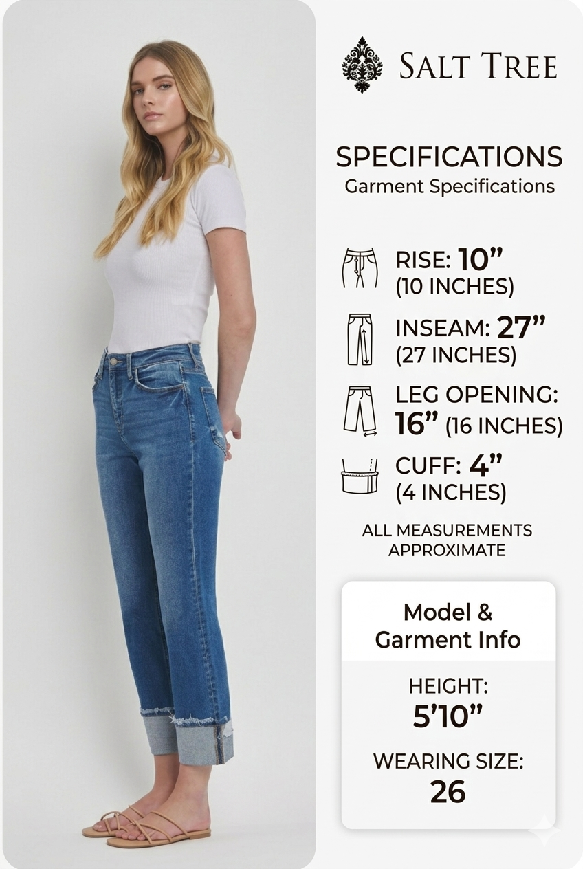 Description: Effortlessly blend vintage charm with modern edge in Vervet's High-Rise Cuffed Straight Jeans in the vibrant medium-blue wash "Daphne." These jeans are defined by a bold 4-inch single cuff hem with raw-edge detailing, adding a structured and trendy finish to the classic straight-leg silhouette. Subtle distressed detailing near the pockets and authentic whiskering at the hips provide a premium, lived-in aesthetic. Perfect for showcasing your favorite footwear, these cropped straight jeans are a versatile addition to any forward-thinking wardrobe.