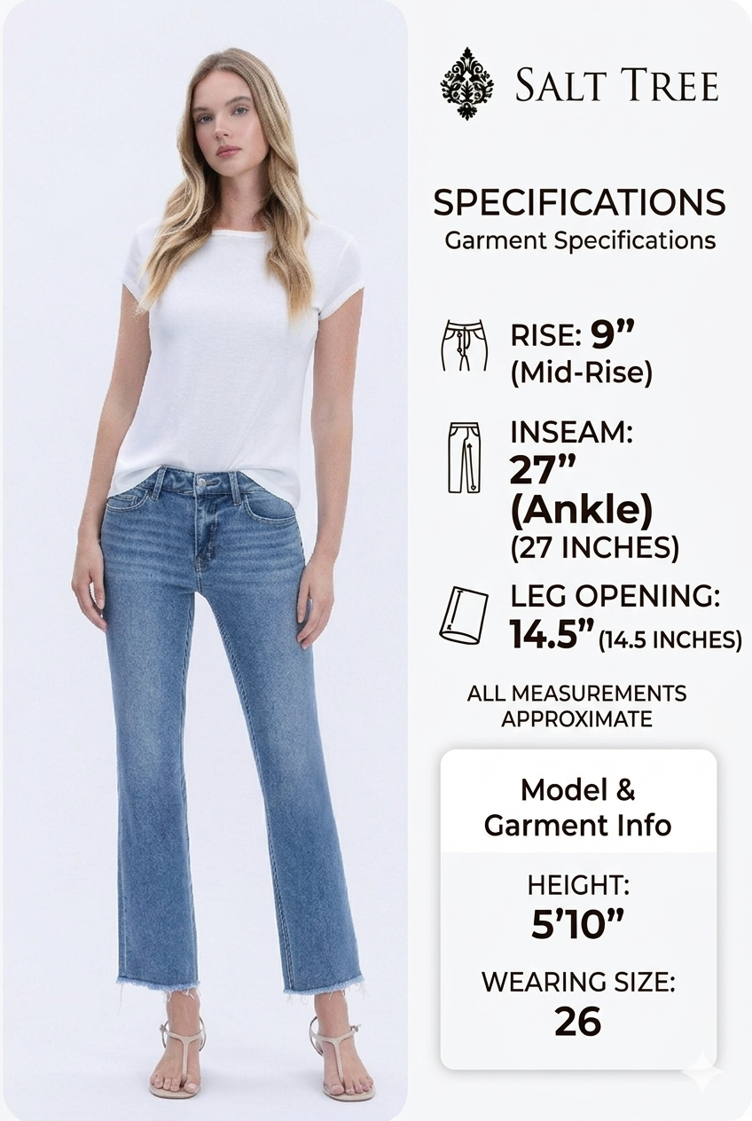Description: Elevate your everyday denim collection with Vervet's Mid-Rise Straight Jeans in the beautiful medium wash "Five Steps to Heaven." Designed for effortless style, these jeans feature a classic straight-leg silhouette with a modern cropped length and a trendy frayed raw hem that creates a lived-in, relaxed aesthetic. This non-distressed style is accented by light whiskering at the hips and subtle fading through the thighs for a premium, authentic look. The traditional five-pocket design and clean finish make this pair a versatile staple for any season.