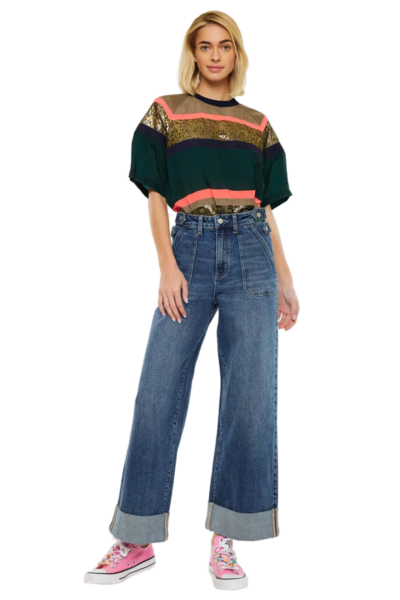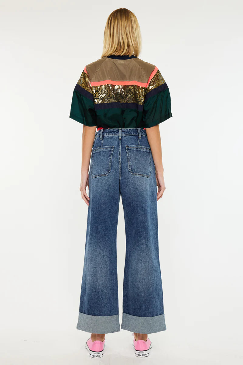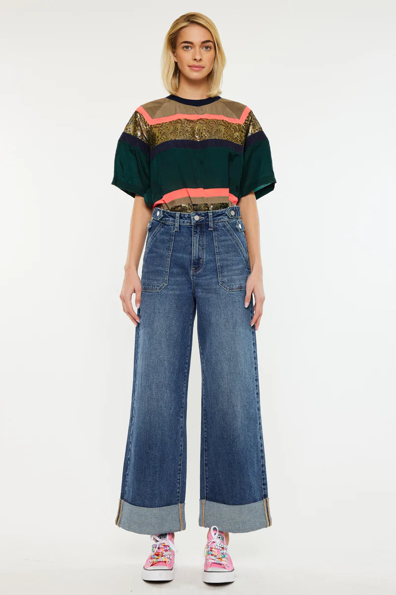 Description: Step back into the best of the decade with the Haylee Ultra High Rise 90's Wide jeans. These jeans feature a sophisticated dark wash and a distinct 90s-inspired wide-leg silhouette that flares comfortably from the thigh. The standout design is anchored by a bold 3" double cuff hem and functional style details like back darts and slant front pockets. For a custom fit, the waistband includes four adjusters with snap buttons, allowing you to cinch the waist for a perfectly tailored, snug look.