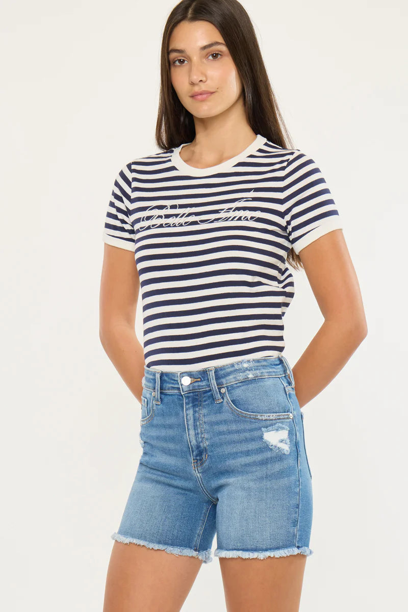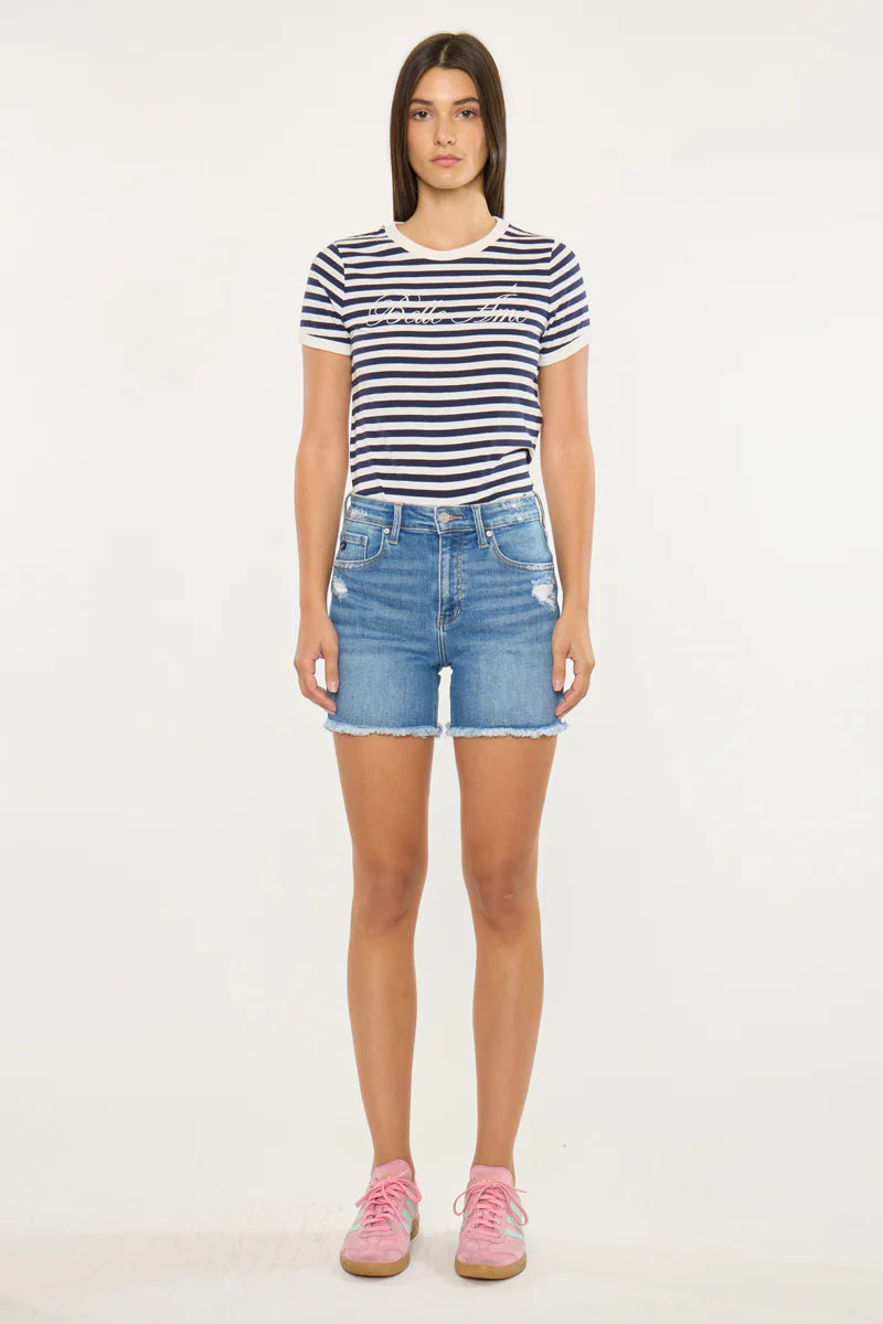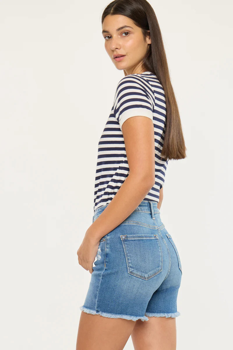 The Marla High Rise Shorts provide that essential, classic denim look and feel that every wardrobe needs. Featured in a beautiful, versatile medium wash color, these shorts are incredibly easy to style for any summer occasion. They are designed with a playful frayed hem and subtle distress details at the front pockets for a touch of character. Finished with a standard 5-pocket layout, a classic single-button closure, and a functional zip fly.