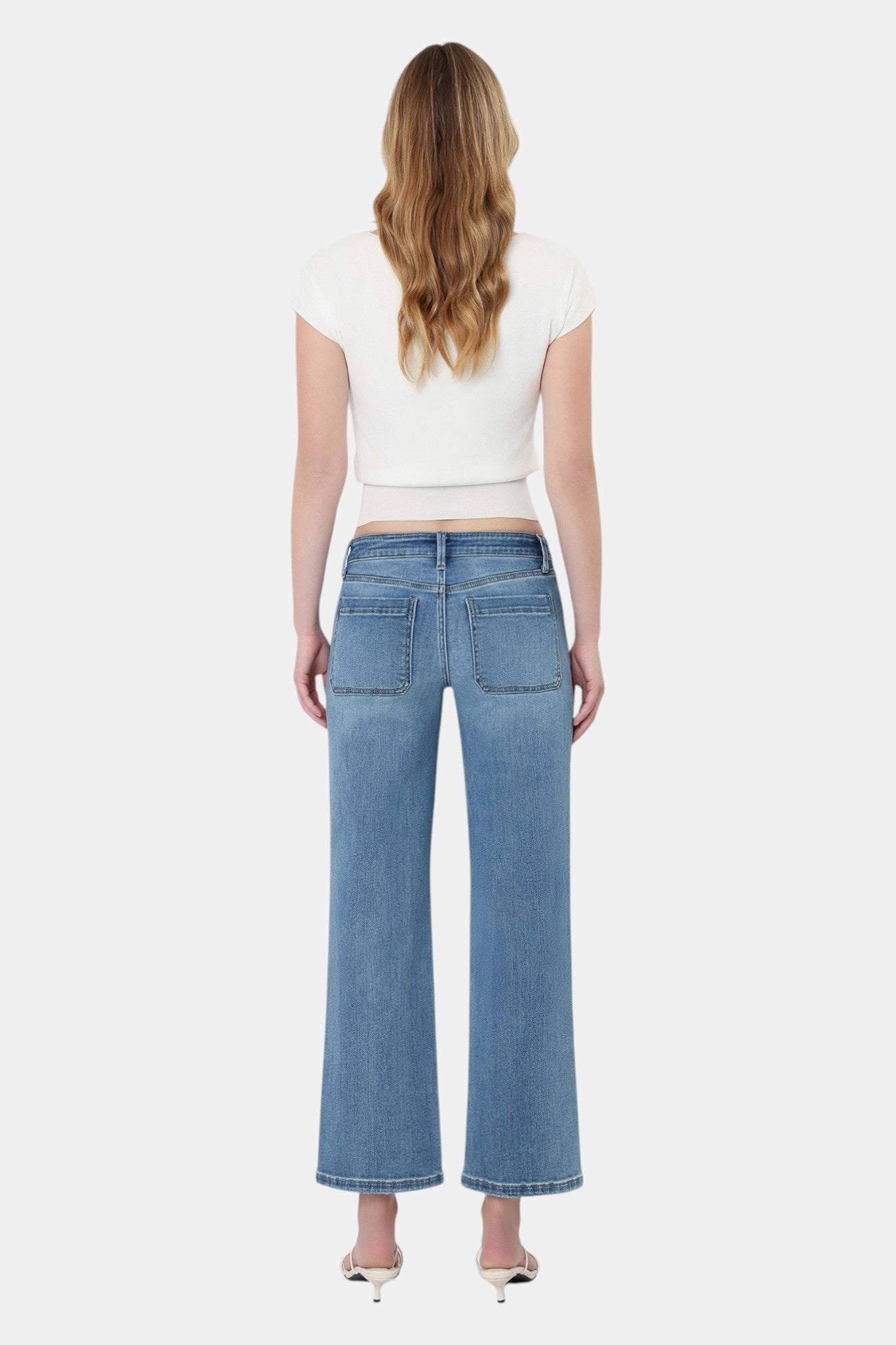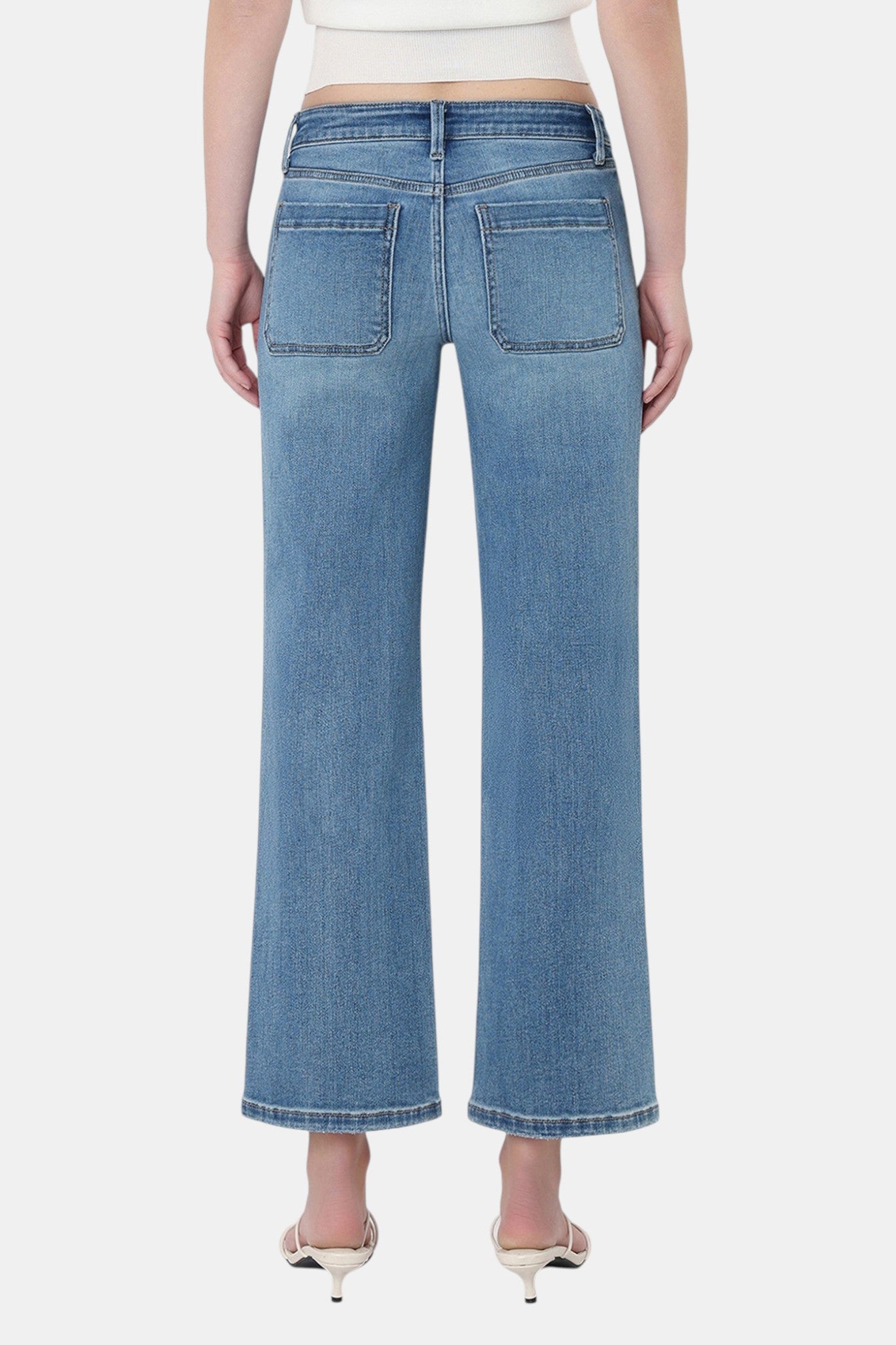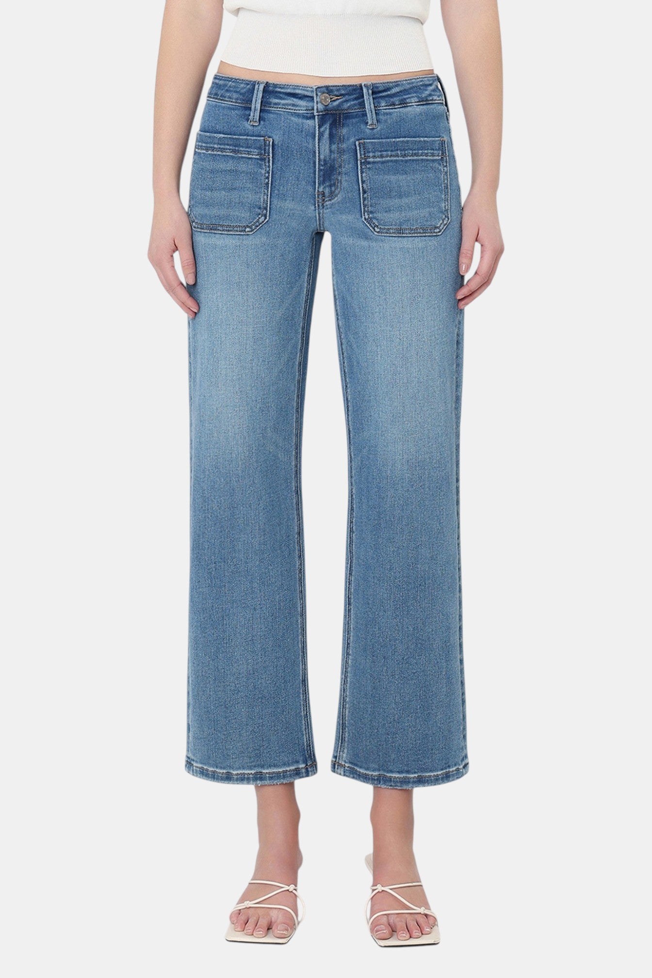 Description: Turn heads with these Vervet Mid Rise Patch Pocket Slim Wide Leg Jeans in a laid-back Of The Band medium wash. The standout oversized patch pockets at the front give these jeans a relaxed, utilitarian vibe that sets them apart from the rest. A slim wide leg silhouette paired with a cropped 27" inseam makes them the perfect match for strappy sandals or your favorite mules — effortlessly cool from morning to night.