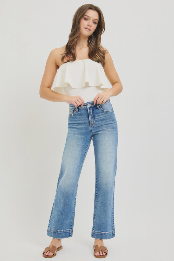 Description: Elevate your everyday rotation with the Risen Tummy Control High-Rise Straight Jeans. Designed for a sleek and polished silhouette, these jeans feature specialized tummy-control technology that provides a smooth, secure fit at the waist without sacrificing comfort. Featured in a timeless medium wash with light whiskering and a clean straight-leg profile, this pair transitions effortlessly from casual office days to weekend outings.